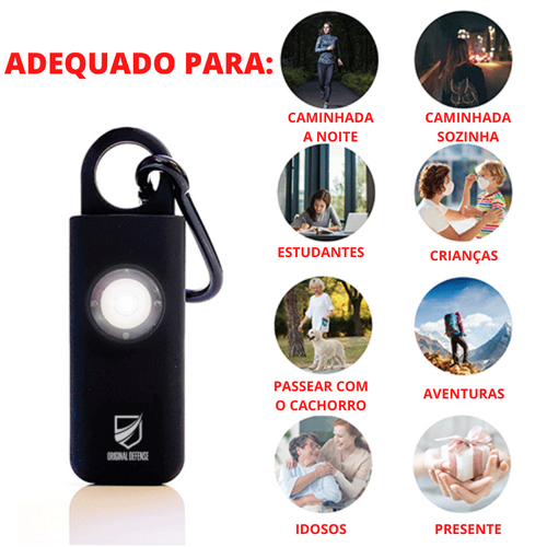 O alarme auto defesa produz um som penetrante (130 db) que certamente desorientará e ajudará a afastar ameaças em potencial. Detém mais invasores do que sprays de pimenta e tasers.