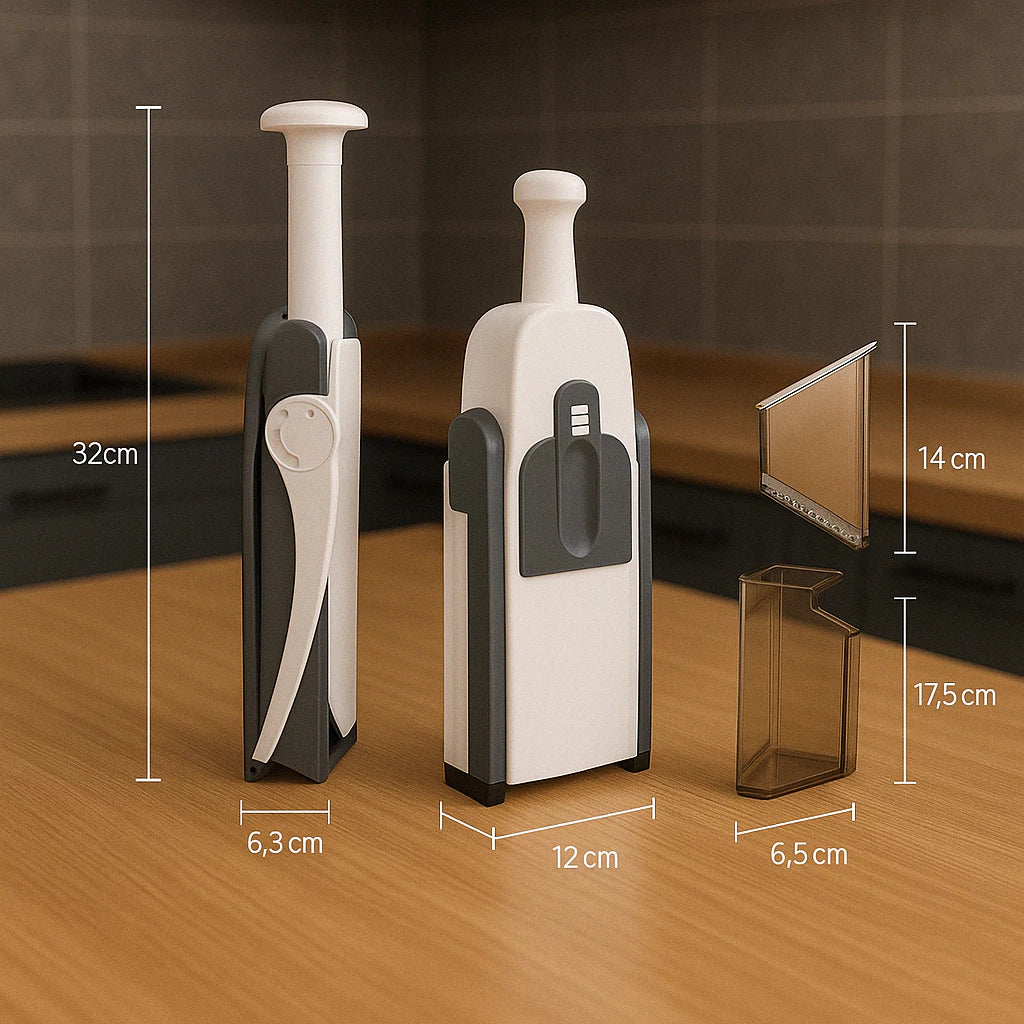Com cinco funções diferentes em um único produto, você pode fatiar, ralar, cortar em tiras, cubos ou julienne, ajustando a espessura conforme a sua necessidade — de 0,5 mm a 8 mm. Ideal para preparar batatas, cenouras, pepinos, cebolas, tomates, frutas, queijos e muito mais, deixando seus pratos com aparência impecável e textura perfeita.