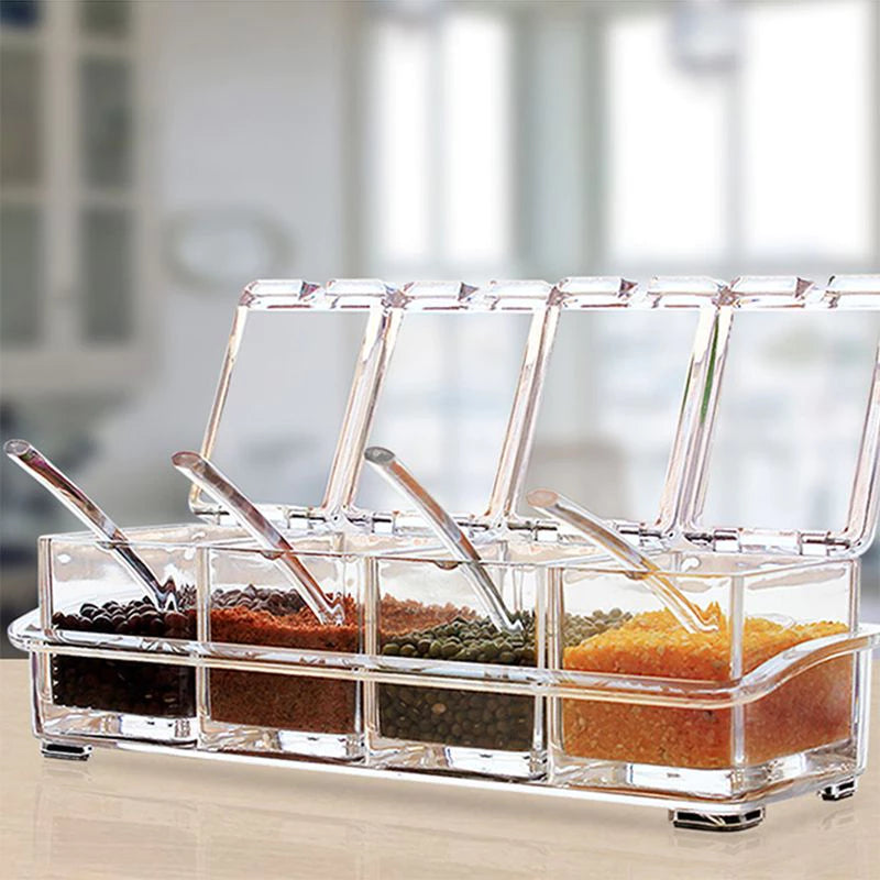 Quantidade: 4 potes com tampa + colheres + bandeja organizadora